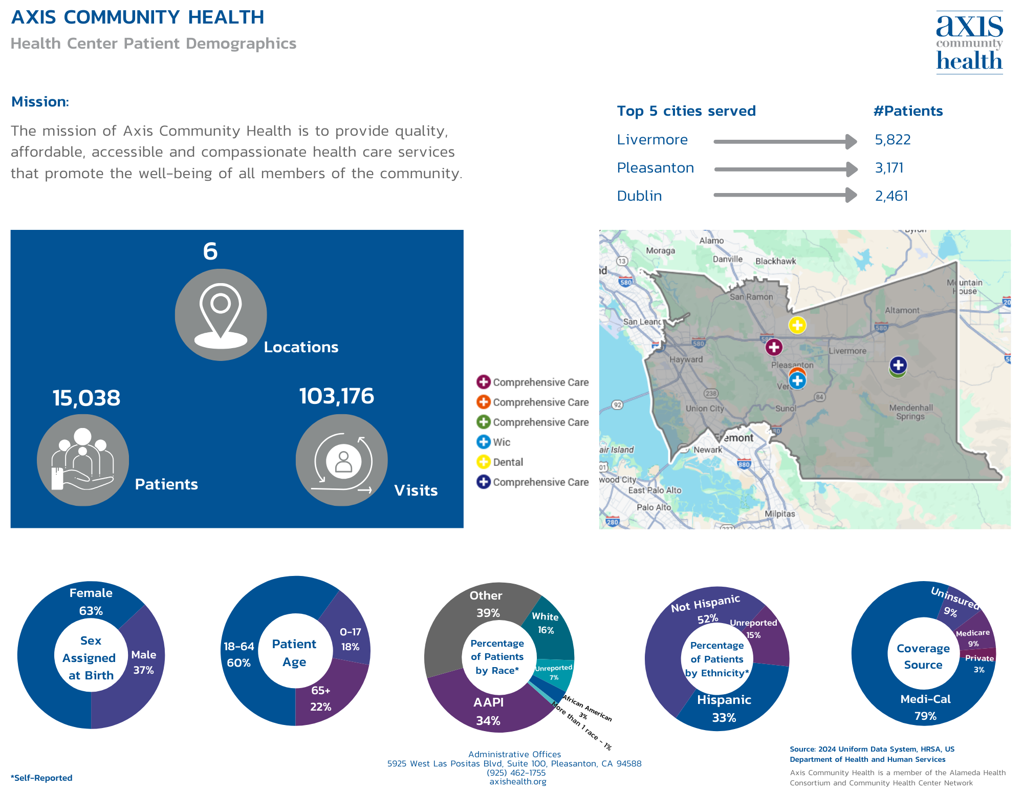 - Axis provides over 100,000 patient visits a year for more than 15,000 people across five service sites located throughout Pleasanton, Livermore, and Dublin.